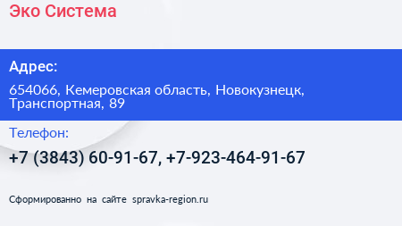 Эко-Система по адресу 654066, Кемеровская область, Новокузнецк, Транспортная, 89 в дальнейшем Организация, размещена в следующих категориях: