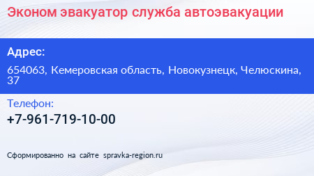 Эконом эвакуатор, служба автоэвакуации по адресу 654063, Кемеровская область, Новокузнецк, Челюскина, 37 в дальнейшем Организация, размещена в следующих категориях:
