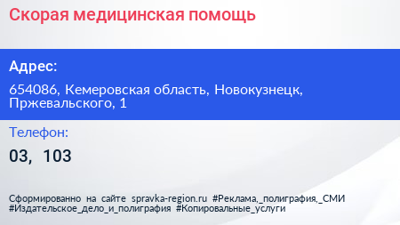 Скорая медицинская помощь по адресу 654086, Кемеровская область, Новокузнецк, Пржевальского, 1 в дальнейшем Организация, размещена в следующих категориях: