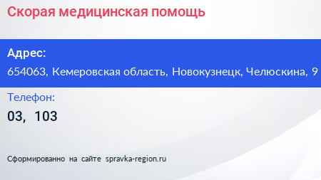 Скорая медицинская помощь по адресу 654063, Кемеровская область, Новокузнецк, Челюскина, 9 в дальнейшем Организация, размещена в следующих категориях:
