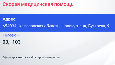 Скорая медицинская помощь по адресу 654034, Кемеровская область, Новокузнецк, Бугарева, 9 в дальнейшем Организация, размещена в следующих категориях: