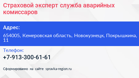 Страховой эксперт, служба аварийных комиссаров по адресу 654005, Кемеровская область, Новокузнецк, Покрышкина, 11 в дальнейшем Организация, размещена в следующих категориях: