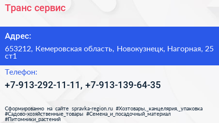 Транс-сервис по адресу 653212, Кемеровская область, Новокузнецк, Нагорная, 25 ст1 в дальнейшем Организация, размещена в следующих категориях: