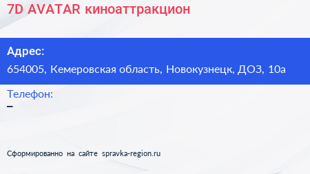 7D AVATAR, киноаттракцион по адресу 654005, Кемеровская область, Новокузнецк, ДОЗ, 10а в дальнейшем Организация, размещена в следующих категориях: