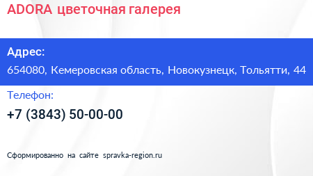 ADORA, цветочная галерея по адресу 654080, Кемеровская область, Новокузнецк, Тольятти, 44 в дальнейшем Организация, размещена в следующих категориях: