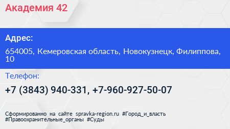 Академия 42 по адресу 654005, Кемеровская область, Новокузнецк, Филиппова, 10 в дальнейшем Организация, размещена в следующих категориях: