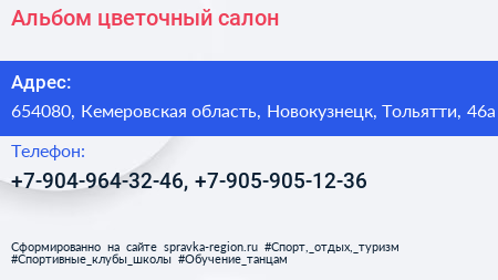 Альбом цветочный, салон по адресу 654080, Кемеровская область, Новокузнецк, Тольятти, 46а в дальнейшем Организация, размещена в следующих категориях: