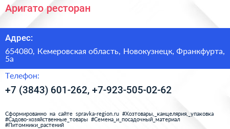 Аригато, ресторан по адресу 654080, Кемеровская область, Новокузнецк, Франкфурта, 5а в дальнейшем Организация, размещена в следующих категориях: