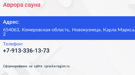 Аврора, сауна по адресу 654063, Кемеровская область, Новокузнецк, Карла Маркса, 2 в дальнейшем Организация, размещена в следующих категориях: