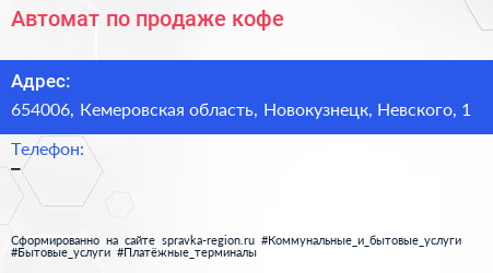Автомат по продаже кофе по адресу 654006, Кемеровская область, Новокузнецк, Невского, 1 в дальнейшем Организация, размещена в следующих категориях:
