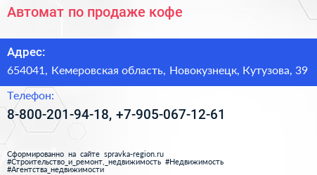 Автомат по продаже кофе по адресу 654041, Кемеровская область, Новокузнецк, Кутузова, 39 в дальнейшем Организация, размещена в следующих категориях: