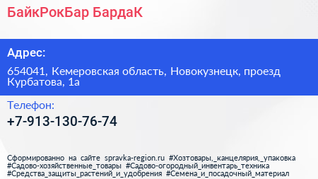БайкРокБар БардаК по адресу 654041, Кемеровская область, Новокузнецк, проезд Курбатова, 1а в дальнейшем Организация, размещена в следующих категориях: