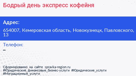 Бодрый день, экспресс-кофейня по адресу 654007, Кемеровская область, Новокузнецк, Павловского, 13 в дальнейшем Организация, размещена в следующих категориях: