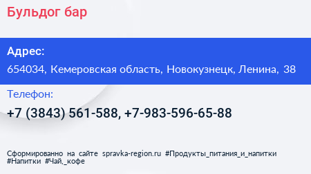 Бульдог, бар по адресу 654034, Кемеровская область, Новокузнецк, Ленина, 38 в дальнейшем Организация, размещена в следующих категориях: