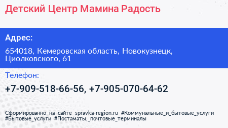 Детский Центр Мамина Радость по адресу 654018, Кемеровская область, Новокузнецк, Циолковского, 61 в дальнейшем Организация, размещена в следующих категориях: