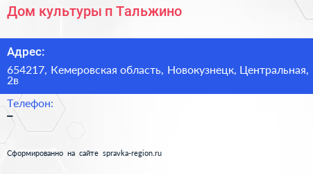 Дом культуры, п. Тальжино по адресу 654217, Кемеровская область, Новокузнецк, Центральная, 2в в дальнейшем Организация, размещена в следующих категориях: