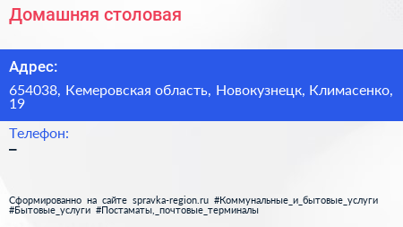 Домашняя столовая по адресу 654038, Кемеровская область, Новокузнецк, Климасенко, 19 в дальнейшем Организация, размещена в следующих категориях: