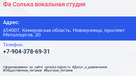 Фа-Солька, вокальная студия по адресу 654007, Кемеровская область, Новокузнецк, проспект Металлургов, 20 в дальнейшем Организация, размещена в следующих категориях: