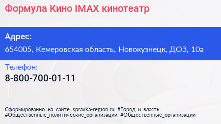 Формула Кино IMAX, кинотеатр по адресу 654005, Кемеровская область, Новокузнецк, ДОЗ, 10а в дальнейшем Организация, размещена в следующих категориях: