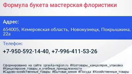 Формула букета, мастерская флористики по адресу 654005, Кемеровская область, Новокузнецк, Покрышкина, 22а в дальнейшем Организация, размещена в следующих категориях: