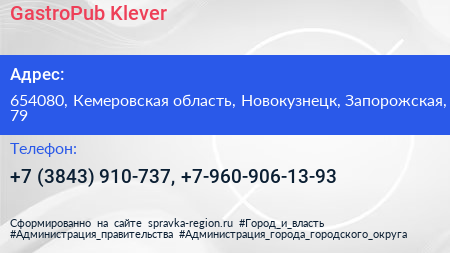 GastroPub Klever по адресу 654080, Кемеровская область, Новокузнецк, Запорожская, 79 в дальнейшем Организация, размещена в следующих категориях:
