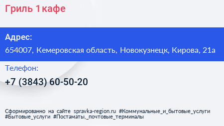 Гриль №1, кафе по адресу 654007, Кемеровская область, Новокузнецк, Кирова, 21а в дальнейшем Организация, размещена в следующих категориях: