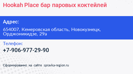 Hookah Place, бар паровых коктейлей по адресу 654007, Кемеровская область, Новокузнецк, Орджоникидзе, 29а в дальнейшем Организация, размещена в следующих категориях: