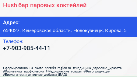 Hush, бар паровых коктейлей по адресу 654027, Кемеровская область, Новокузнецк, Кирова, 5 в дальнейшем Организация, размещена в следующих категориях:
