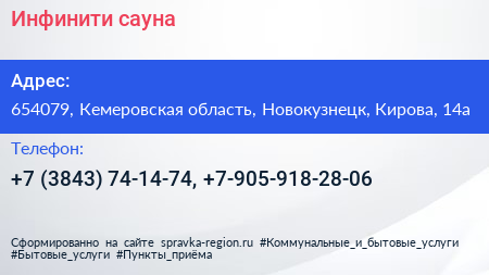 Инфинити, сауна по адресу 654079, Кемеровская область, Новокузнецк, Кирова, 14а в дальнейшем Организация, размещена в следующих категориях: