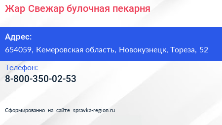 Жар-Свежар, булочная-пекарня по адресу 654059, Кемеровская область, Новокузнецк, Тореза, 52 в дальнейшем Организация, размещена в следующих категориях: