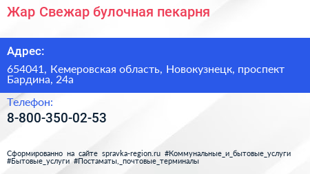 Жар-Свежар, булочная-пекарня по адресу 654041, Кемеровская область, Новокузнецк, проспект Бардина, 24а в дальнейшем Организация, размещена в следующих категориях: