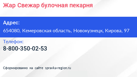 Жар-Свежар, булочная-пекарня по адресу 654080, Кемеровская область, Новокузнецк, Кирова, 97 в дальнейшем Организация, размещена в следующих категориях: