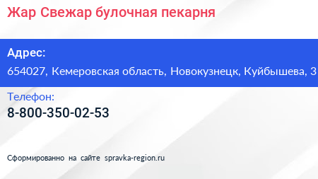 Жар-Свежар, булочная-пекарня по адресу 654027, Кемеровская область, Новокузнецк, Куйбышева, 3 в дальнейшем Организация, размещена в следующих категориях: