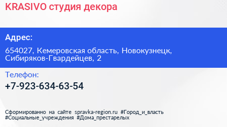 KRASIVO, студия декора по адресу 654027, Кемеровская область, Новокузнецк, Сибиряков-Гвардейцев, 2 в дальнейшем Организация, размещена в следующих категориях: