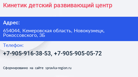 Кинетик, детский развивающий центр по адресу 654044, Кемеровская область, Новокузнецк, Рокоссовского, 3Б в дальнейшем Организация, размещена в следующих категориях: