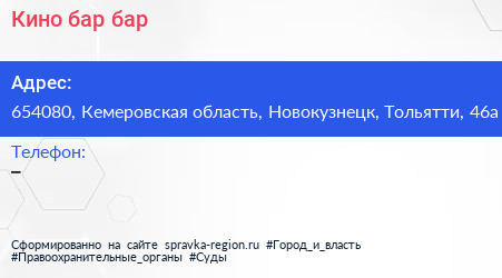 Кино-бар, бар по адресу 654080, Кемеровская область, Новокузнецк, Тольятти, 46а в дальнейшем Организация, размещена в следующих категориях: