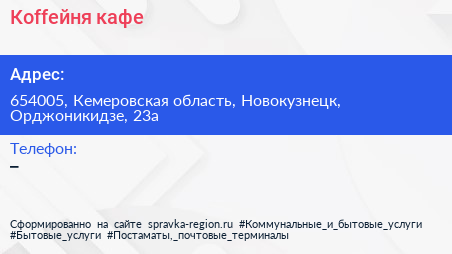 Коffейня, кафе по адресу 654005, Кемеровская область, Новокузнецк, Орджоникидзе, 23а в дальнейшем Организация, размещена в следующих категориях:
