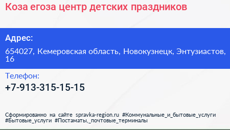 Коза-егоза, центр детских праздников по адресу 654027, Кемеровская область, Новокузнецк, Энтузиастов, 16 в дальнейшем Организация, размещена в следующих категориях:
