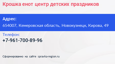 Крошка енот, центр детских праздников по адресу 654007, Кемеровская область, Новокузнецк, Кирова, 49 в дальнейшем Организация, размещена в следующих категориях: