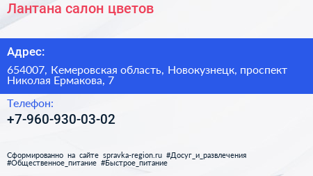 Лантана, салон цветов по адресу 654007, Кемеровская область, Новокузнецк, проспект Николая Ермакова, 7 в дальнейшем Организация, размещена в следующих категориях: