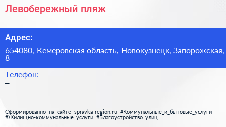 Левобережный, пляж по адресу 654080, Кемеровская область, Новокузнецк, Запорожская, 8 в дальнейшем Организация, размещена в следующих категориях: