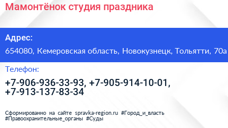 Мамонтёнок, студия праздника по адресу 654080, Кемеровская область, Новокузнецк, Тольятти, 70а в дальнейшем Организация, размещена в следующих категориях: