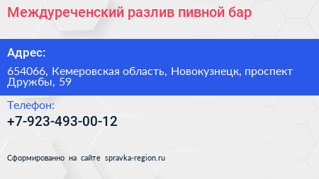 Междуреченский разлив, пивной бар по адресу 654066, Кемеровская область, Новокузнецк, проспект Дружбы, 59 в дальнейшем Организация, размещена в следующих категориях: