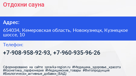 Отдохни, сауна по адресу 654034, Кемеровская область, Новокузнецк, Кузнецкое шоссе, 10 в дальнейшем Организация, размещена в следующих категориях: