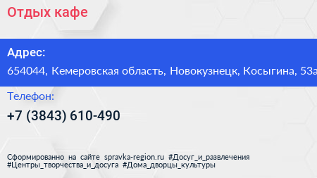 Отдых, кафе по адресу 654044, Кемеровская область, Новокузнецк, Косыгина, 53а в дальнейшем Организация, размещена в следующих категориях:
