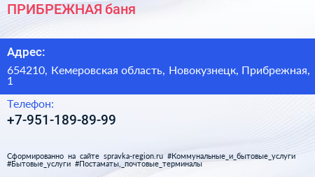 ПРИБРЕЖНАЯ, баня по адресу 654210, Кемеровская область, Новокузнецк, Прибрежная, 1 в дальнейшем Организация, размещена в следующих категориях: