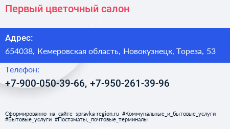 Первый цветочный, салон по адресу 654038, Кемеровская область, Новокузнецк, Тореза, 53 в дальнейшем Организация, размещена в следующих категориях: