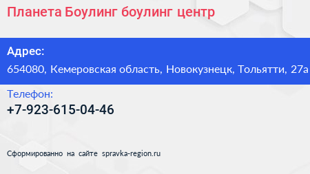 Планета Боулинг, боулинг-центр по адресу 654080, Кемеровская область, Новокузнецк, Тольятти, 27а в дальнейшем Организация, размещена в следующих категориях: