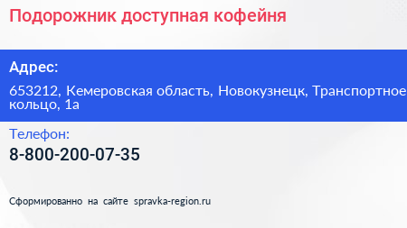 Подорожник, доступная кофейня по адресу 653212, Кемеровская область, Новокузнецк, Транспортное кольцо, 1а в дальнейшем Организация, размещена в следующих категориях: