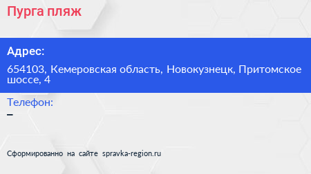 Пурга, пляж по адресу 654103, Кемеровская область, Новокузнецк, Притомское шоссе, 4 в дальнейшем Организация, размещена в следующих категориях: